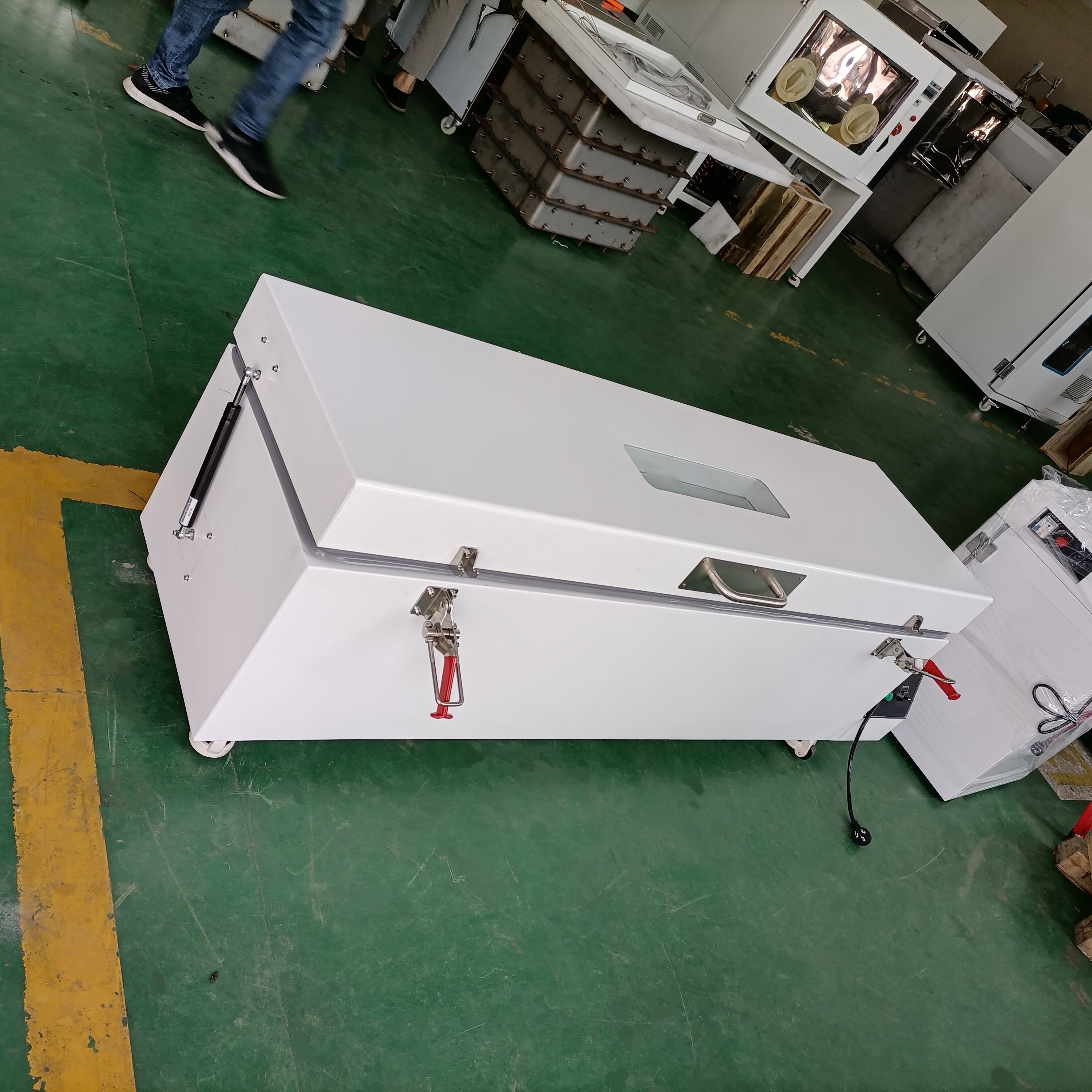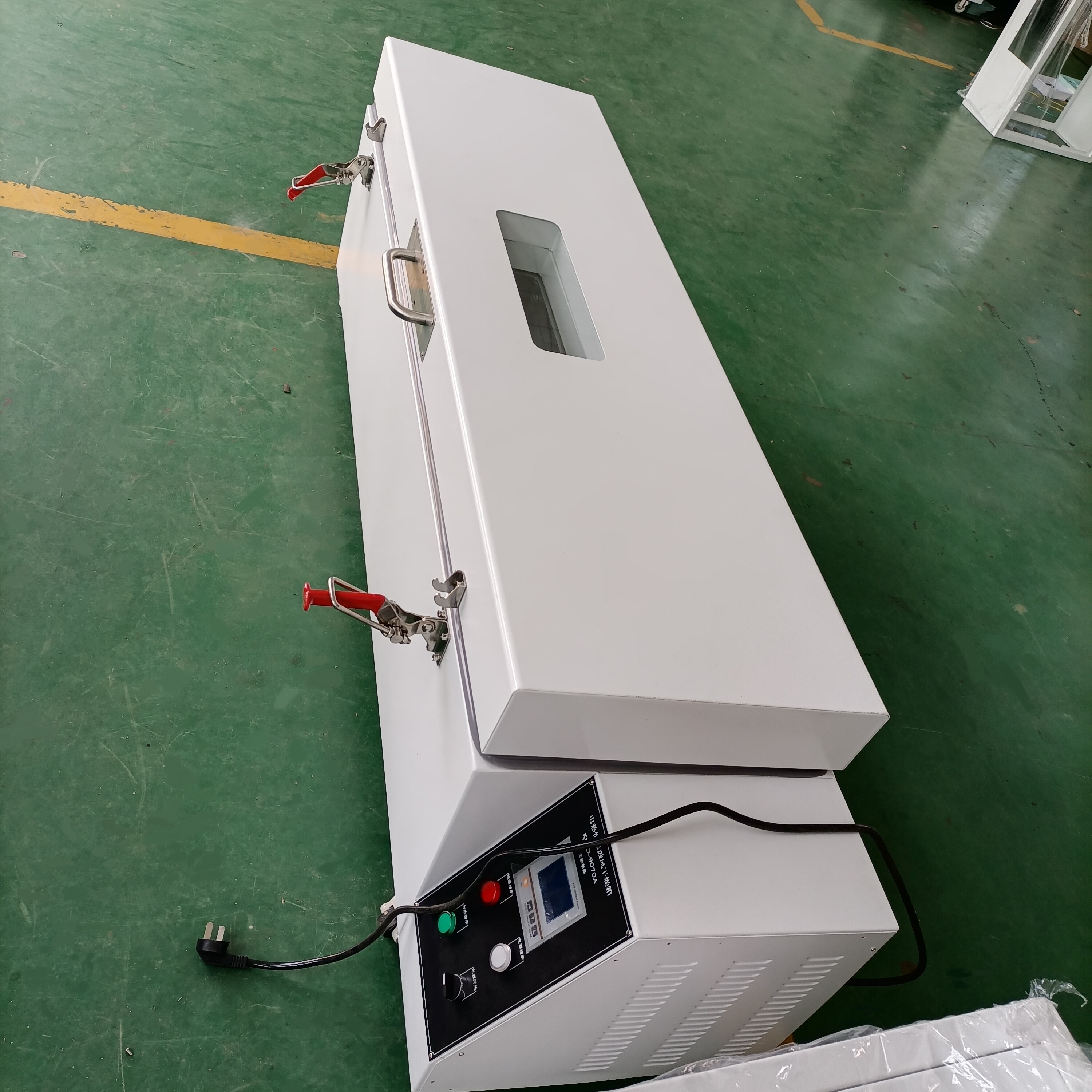 箱門:上開門,硅膠密封圈。箱門采用優(yōu)質(zhì)冷軋鋼板,表面靜電噴塑,涂層堅(jiān)硬牢固,具有防銹能力,顏色為米色。箱門上配備雙層鋼化玻璃視窗。