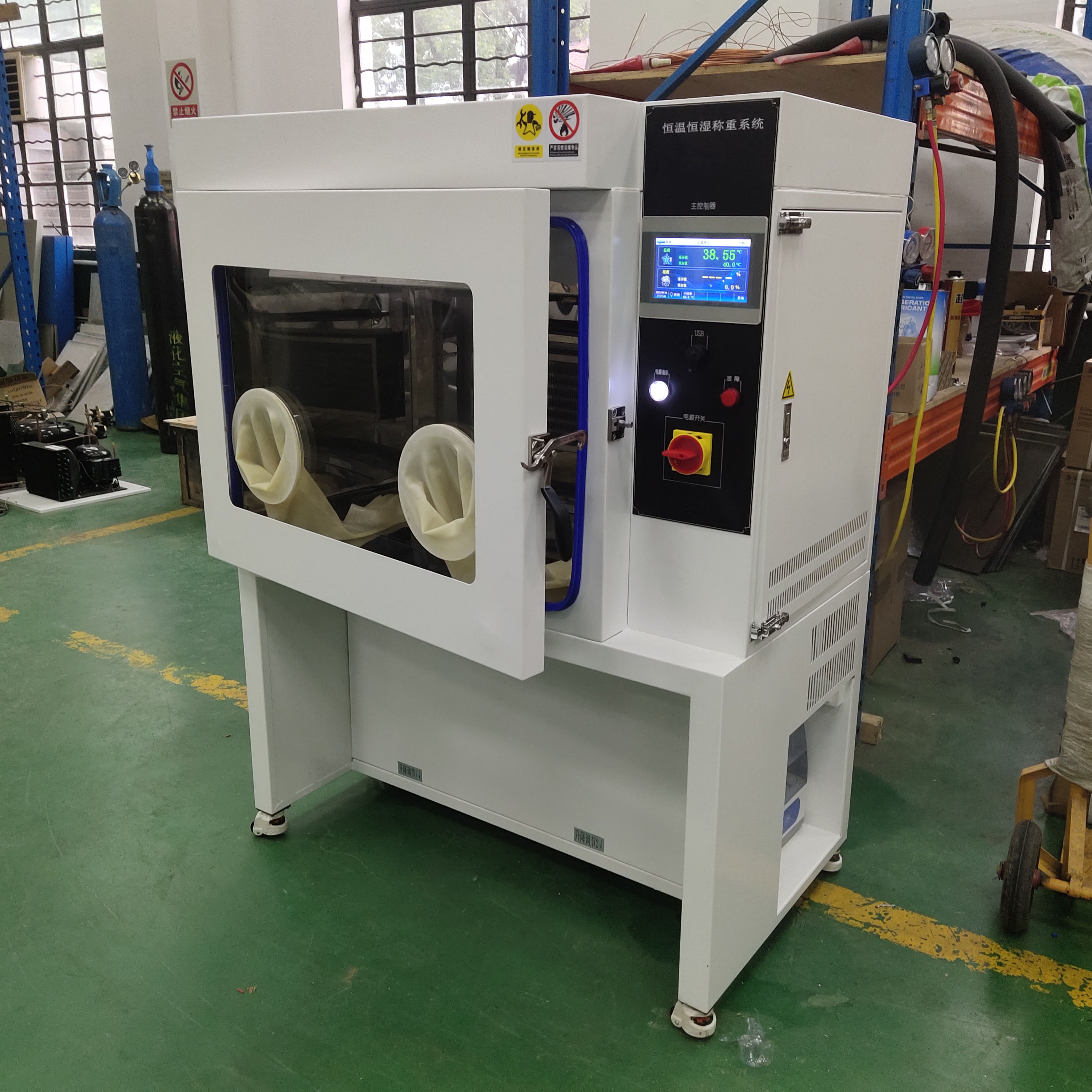 恒溫恒濕稱重系統(tǒng)內(nèi)風(fēng)速不影響樣品的存放,取拿等,恒溫恒濕采用上送風(fēng)下吸風(fēng)的循環(huán)方式,保證箱內(nèi)溫濕度均勻,箱門設(shè)置全框透明窗口,用以觀測(cè)室內(nèi)試樣的變化。觀察窗采用有機(jī)板,具有透明、隔熱、不易產(chǎn)生蒸汽結(jié)霜等優(yōu)點(diǎn);并配置硅膠手套,人工操作過(guò)程中保證恒溫恒濕箱內(nèi)溫濕度波動(dòng)符合HJ836-2017《固定污染源廢氣低濃度顆粒物的測(cè)定重量法》標(biāo)準(zhǔn)要求,天平稱量不受影響。