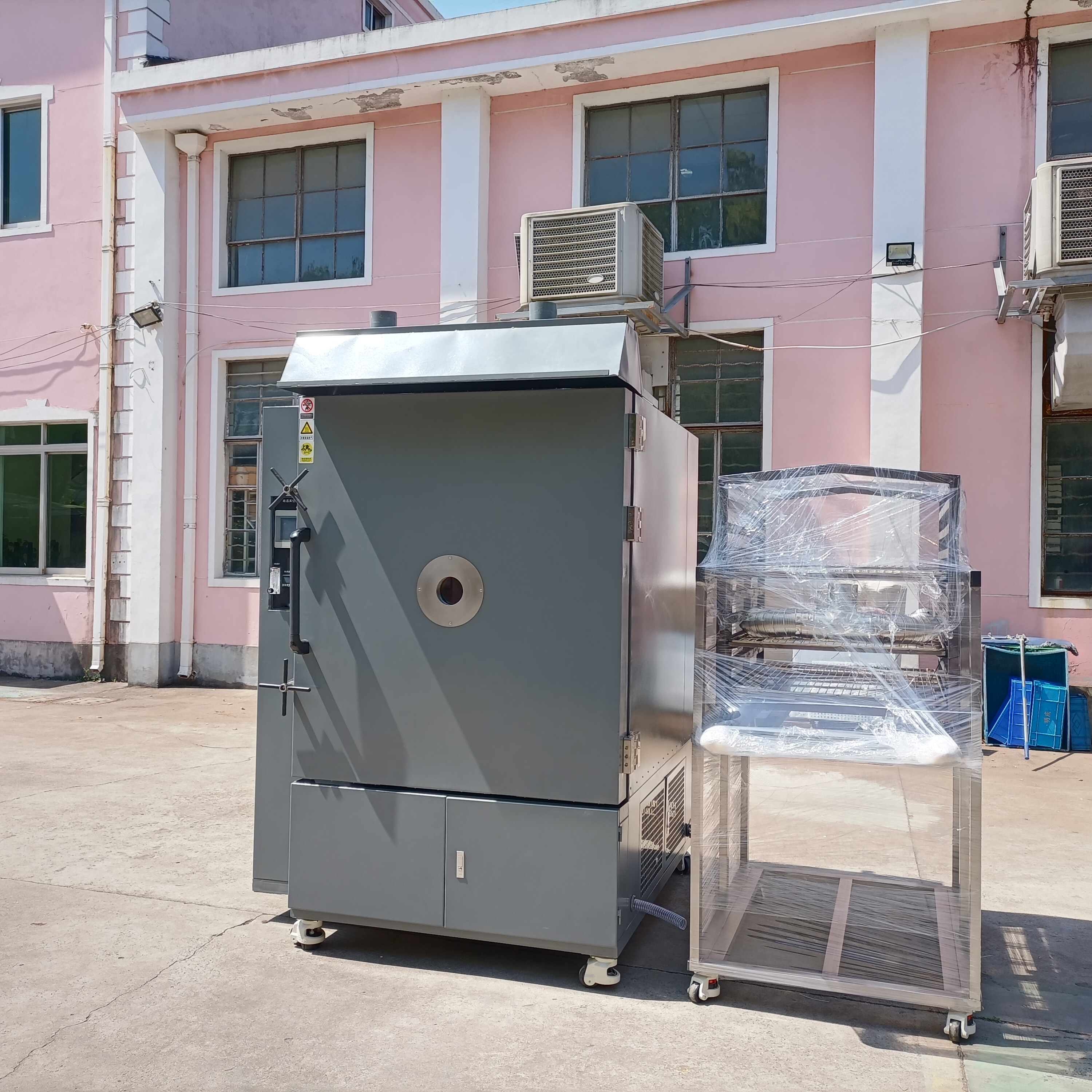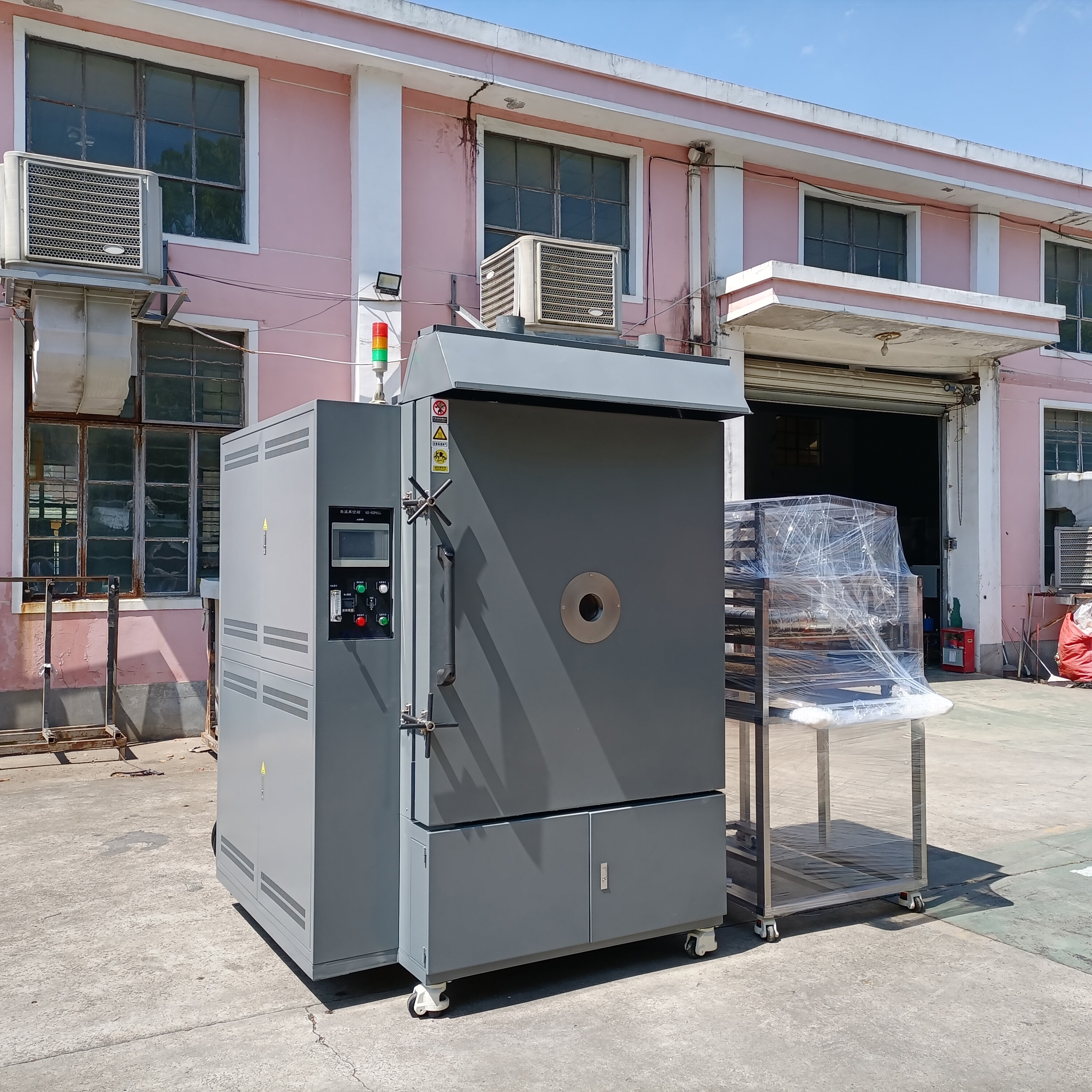箱體結構:采用立式腔體設計,上部為工作腔體、腔體內有三層隔板、下箱柜有真空泵、冷卻管路,腔體內設有抽氣口、氮氣進氣口、抽氣真空閥安裝在箱體底部后背,側面為電器控制柜與操作面板。
